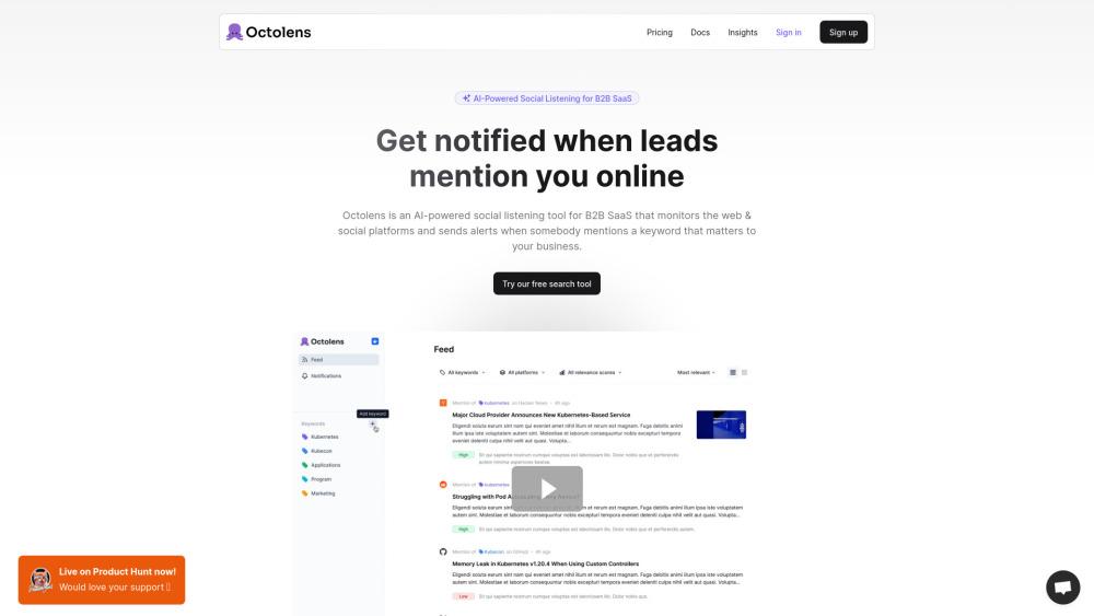Octolens is an AI-powered social listening tool for B2B companies that monitors web and social platforms to send real-time alerts on brand, competitor, or keyword mentions.