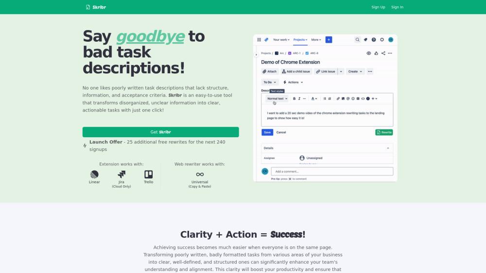 Skribr — это инструмент, который помогает переписывать плохо написанные описания задач в инструментах управления проектами, таких как Jira, Trello и Linear. Он преобразует неупорядоченную, неясную информацию в четкие, действенные задачи всего одним кликом.